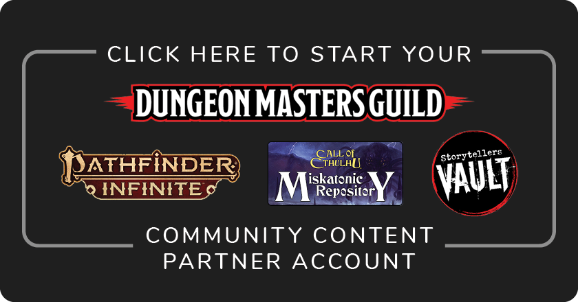 ¿Estás buscando crear contenido para Dungeon Masters Guild, Pathfinder Infinite, Miskatonic Repository y más? Elige esta opción si estás creando un título de contenido comunitario. No necesitas una cuenta de socio editorial y publicarás directamente a través de tu propia cuenta de cliente.